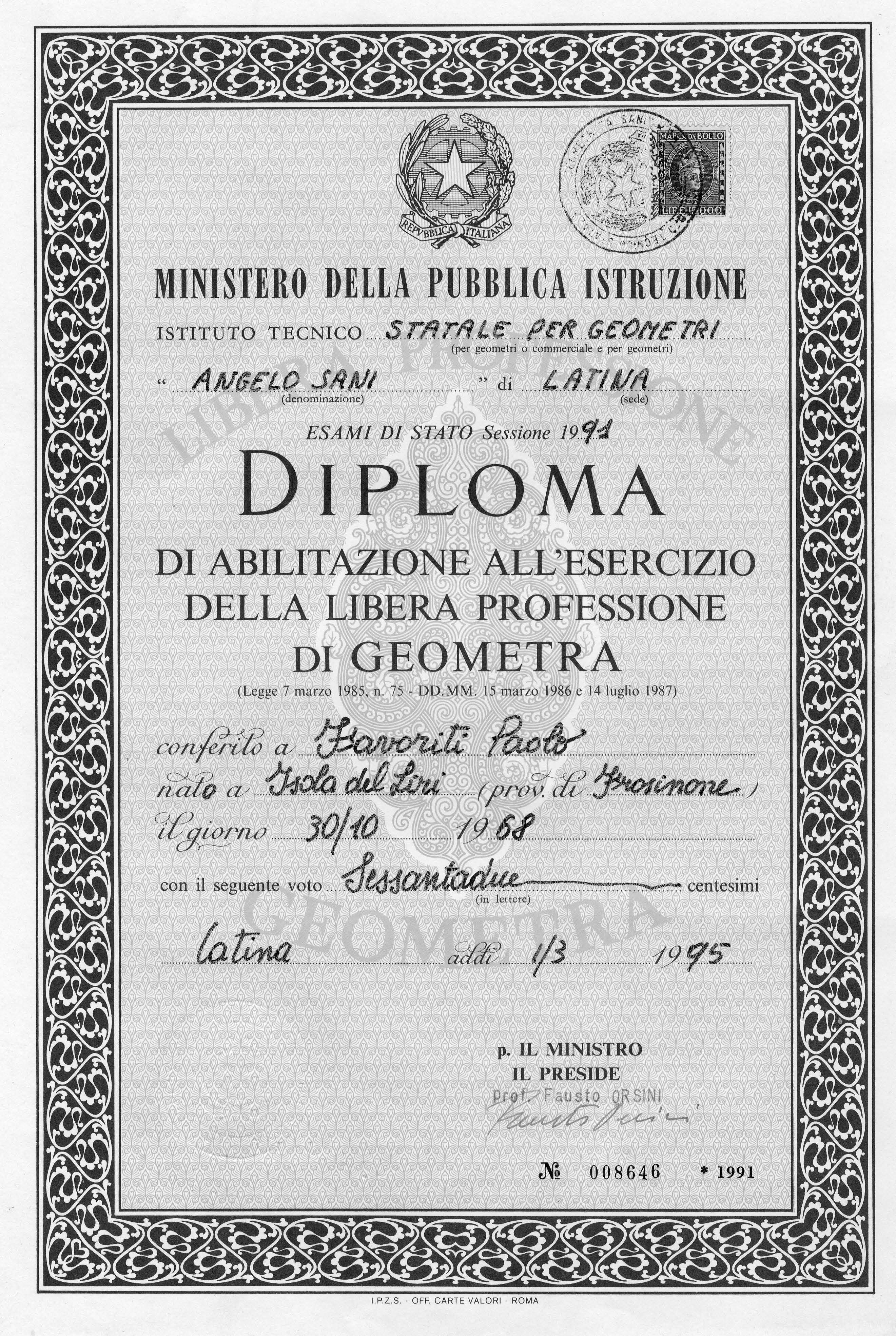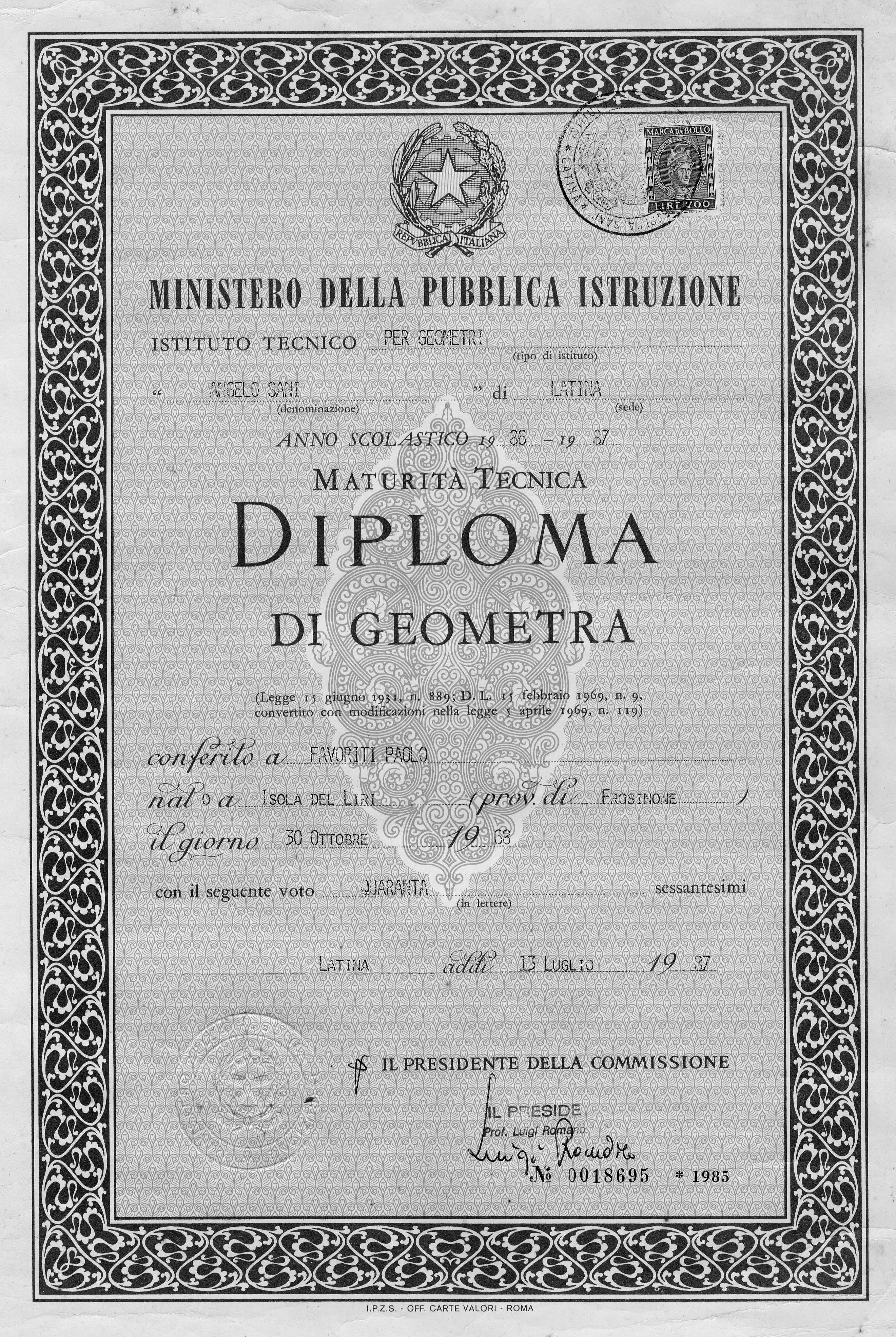 Diploma di Geometra anno scolastico 86/87