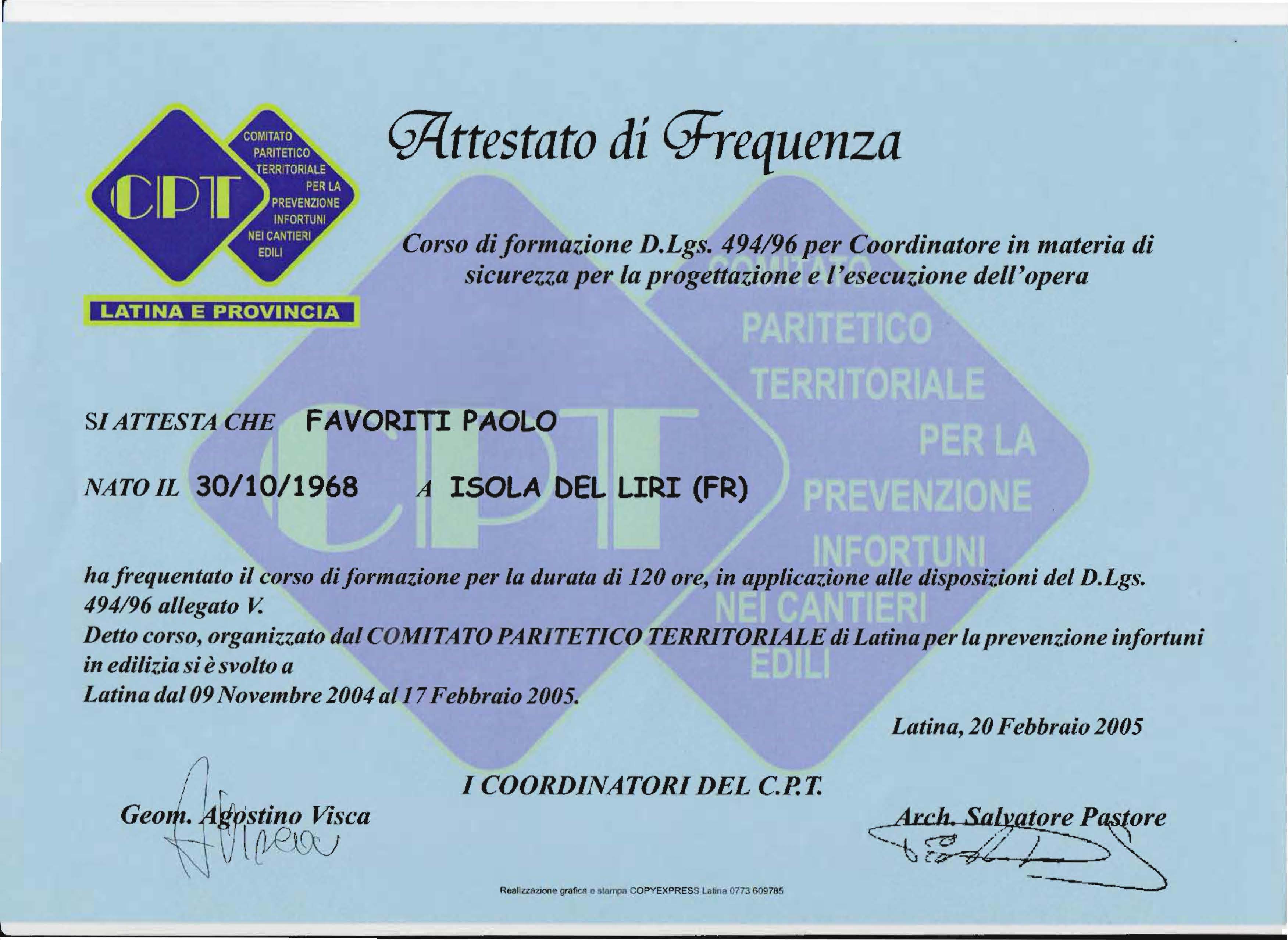 Attestato di Coordinatore per la sicurezza D.Lgs. 494/96 all. V